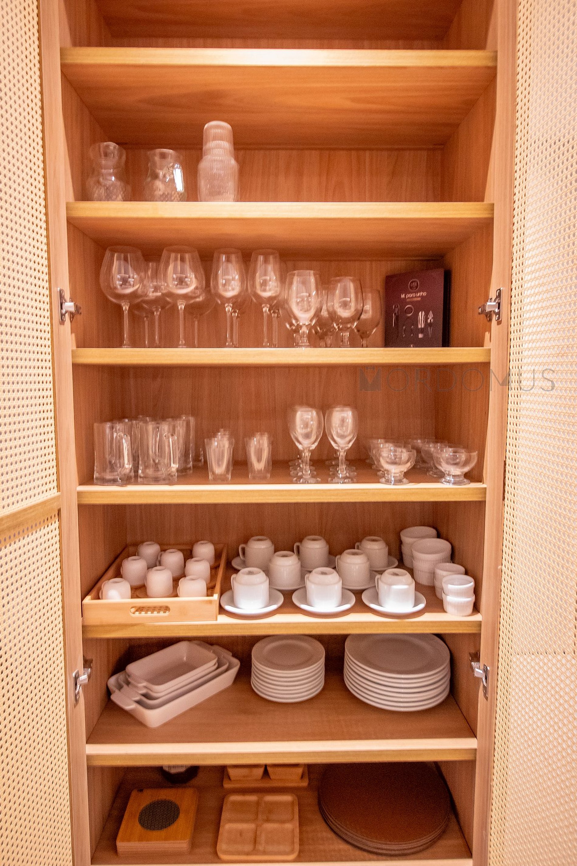 Cristaleira com taças de cristal para vinho, cerveja, vinho branco e whisky