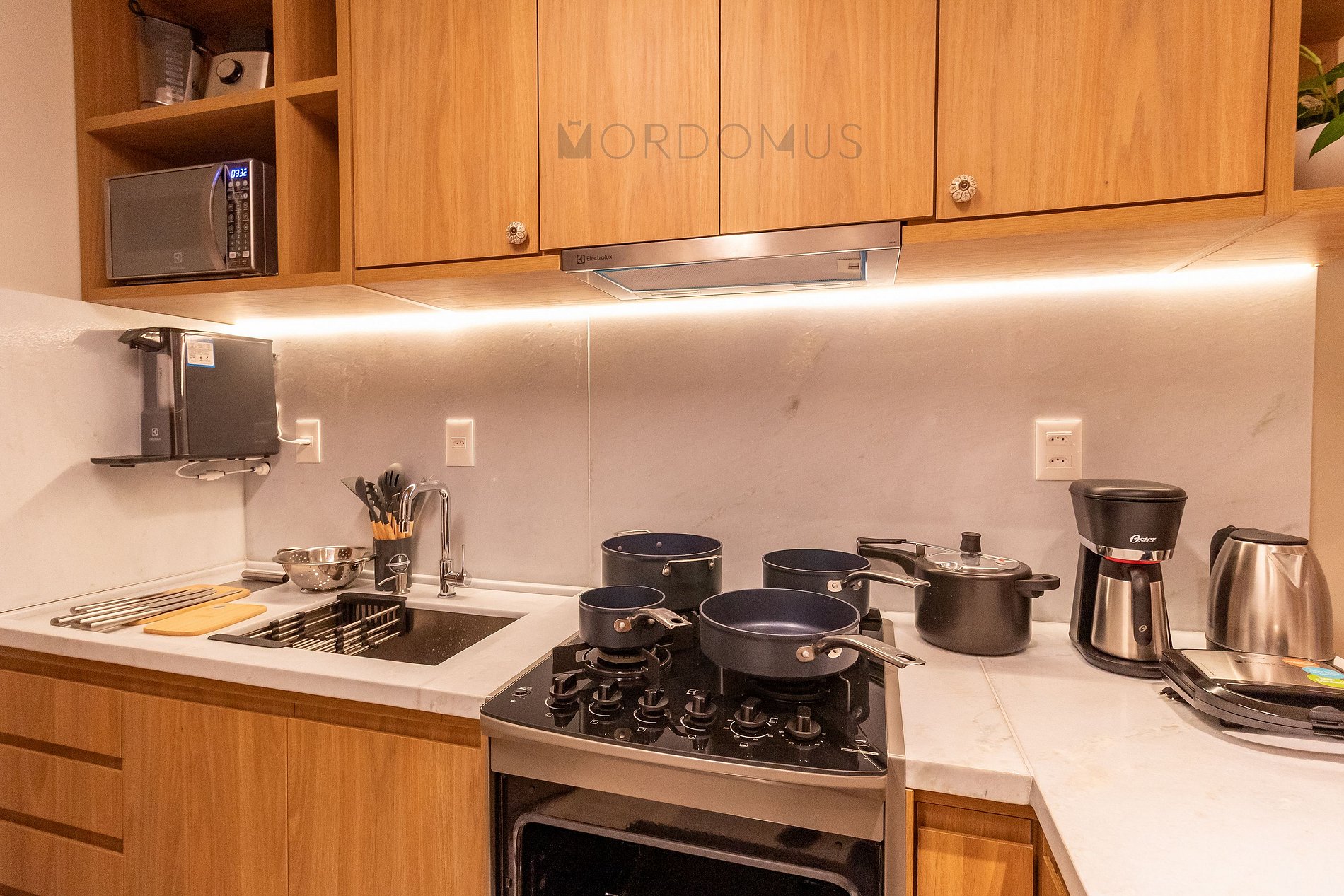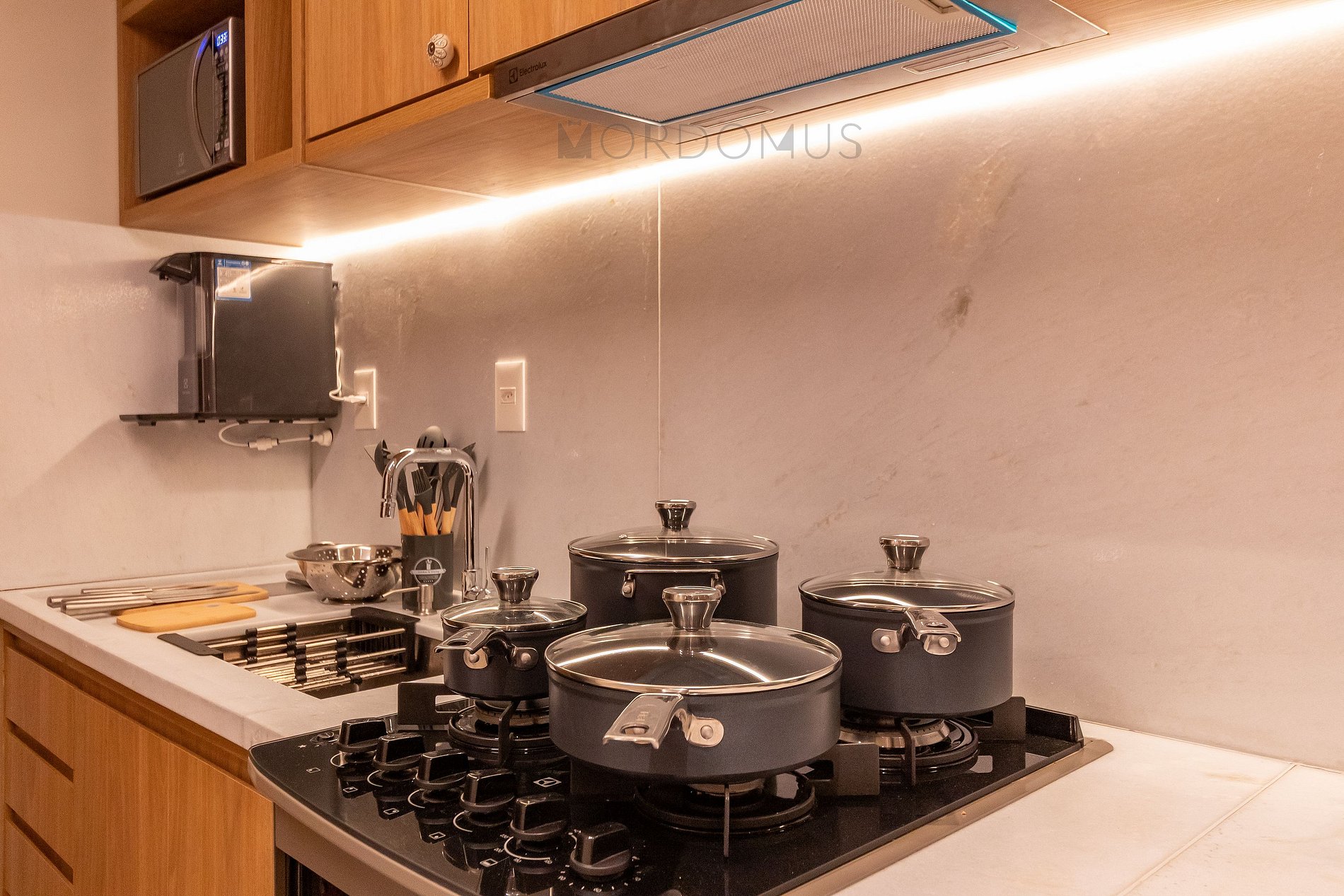 Equipamentos de Alta Qualidade: A cozinha equipada com itens como o jogo de panelas TEFAL PLATINUM e eletrodomésticos premium mostra que você se preocupa com os detalhes e com a experiência do hóspede, permitindo que eles se sintam em casa.