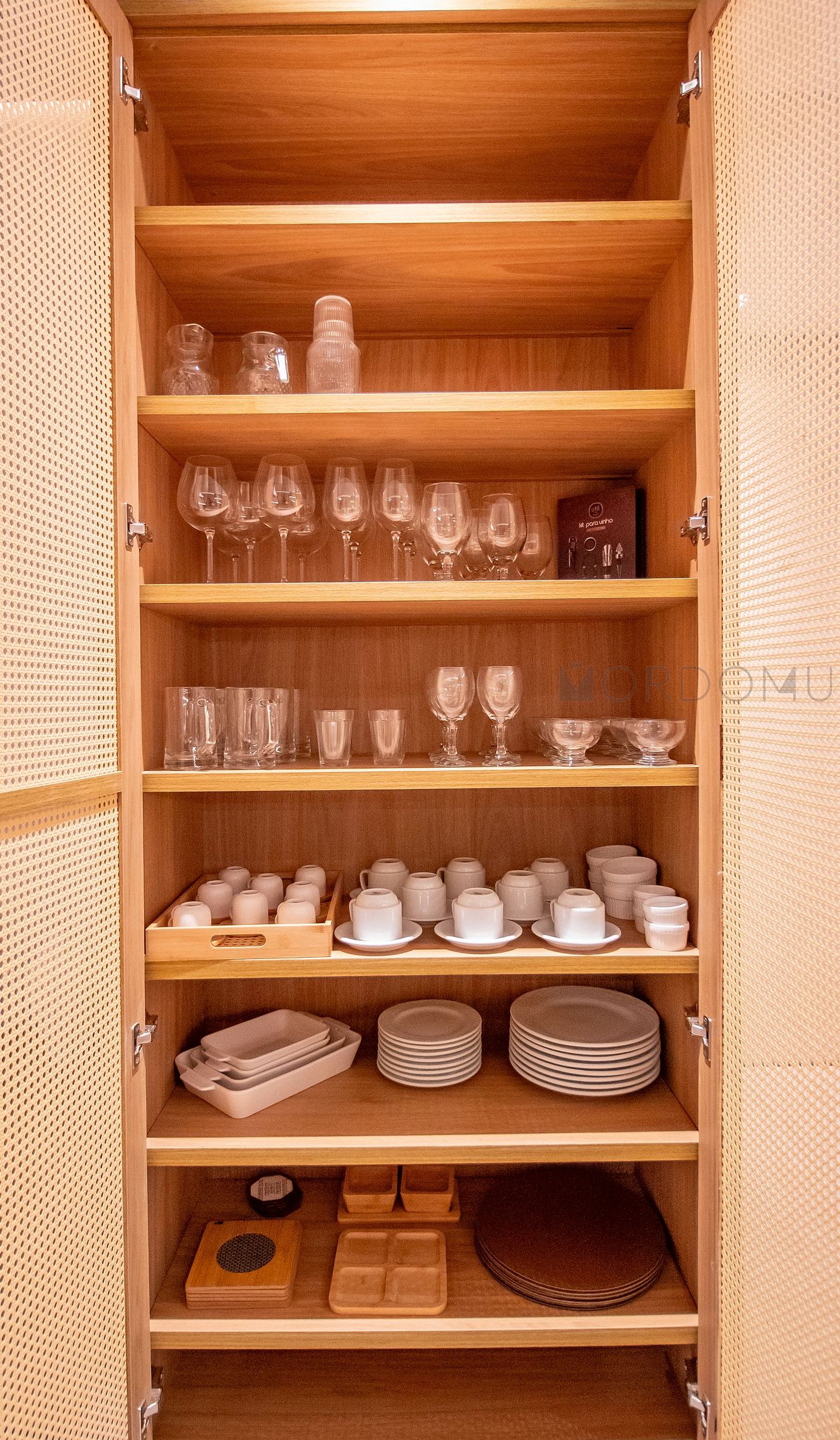 Cristaleira com taças de cristal para vinho, cerveja, vinho branco e whisky